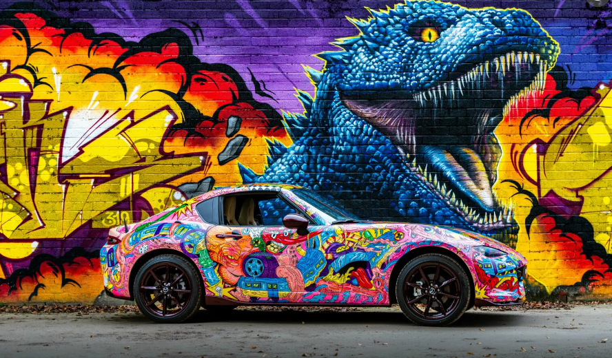 Esta es tu oportunidad de tener un Miata único y llamativo con colores vibrantes y Godzilla pintado en el capó.