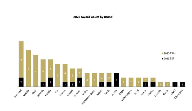 Figura 1. Ranking de la industria IIHS TSP/TSP+ 2025 por fabricante, a diciembre de 2025.